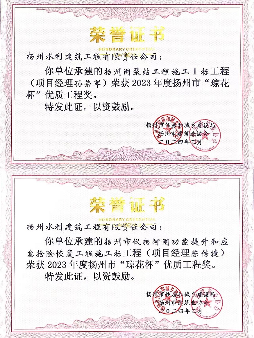 近日,2023年度扬州市“琼花杯”优质工程奖获奖名单揭晓,开云网页版承建的“扬州闸泵站工程施工I标”和“扬州市仪扬河闸功能提升和应急抢险恢复工程施工标”两个项目同时上榜。